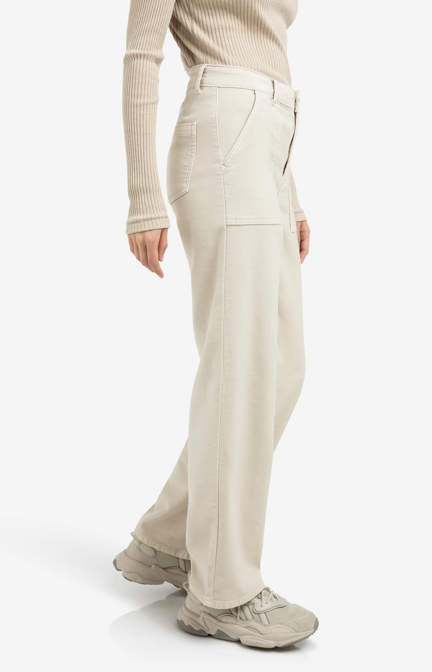These cargo trousers are made from a woven fabric and feature a high waist, straight legs and a loose fit. The patch pockets at the front add a bold touch, while the back pockets and belt loops provide practical details. Ideal for a casual yet polished look. Available in different lengths (30, 32, 34). The length is size 32. The model is 175 cm and wears size 36.