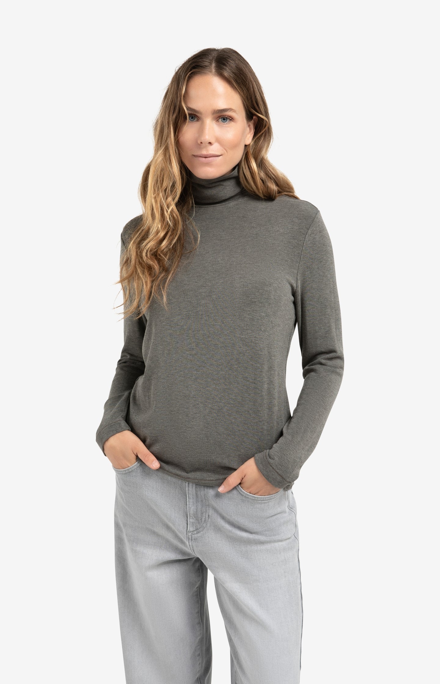 This cosy top is made from a soft, heavyweight jersey fabric that offers warmth and comfort. It features a classic turtleneck, long sleeves, and a straight fit. The subtle side slits add a refined detail. Perfect for layering or wearing on its own during cooler days. A timeless and versatile wardrobe essential. The model is 178 cm and wears size S.