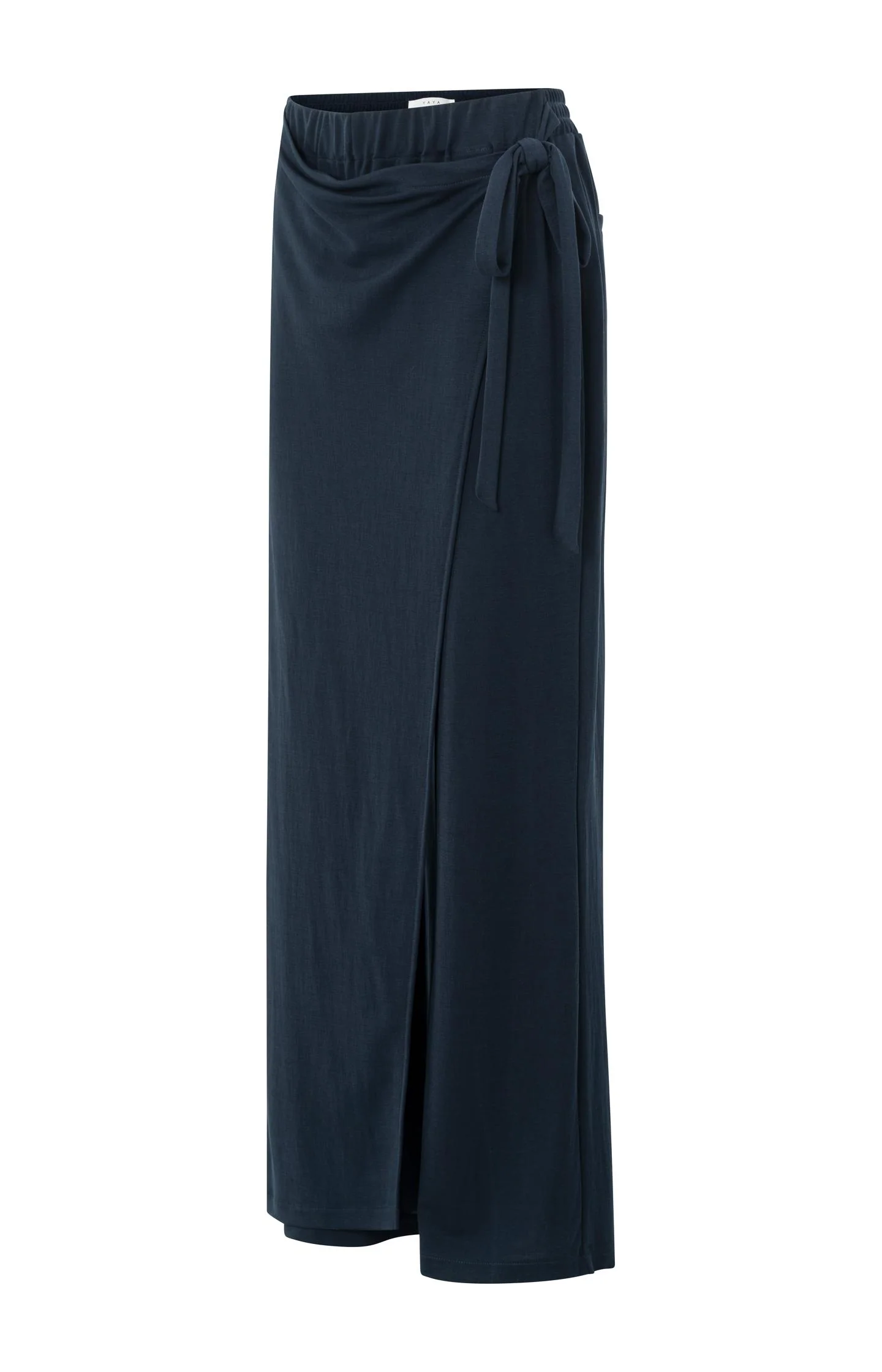 This stylish jersey trousers are made from a soft, supple fabric and feature a unique wrap skirt effect at the front. The elastic waistband with drawstring adds extra comfort. Designed with wide legs, side pockets, and welt pockets at the back. A feminine and contemporary design, perfect for an elegant summer look. The model is 178 cm and wears size 36.