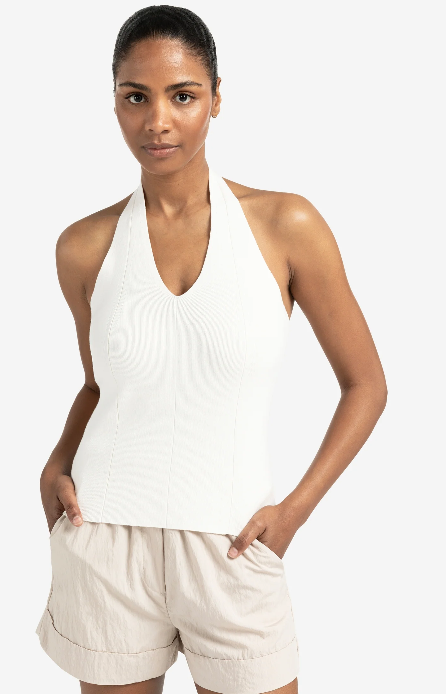 This feminine halter top is knitted from a soft, stretchy fabric and features a flattering fitted silhouette. Designed with a deep V-neckline and a wide strap around the neck, it's sleeveless and minimal in style. Perfect for both casual and elegant outfits thanks to its clean, versatile look. The model is 176 cm and wears size S.