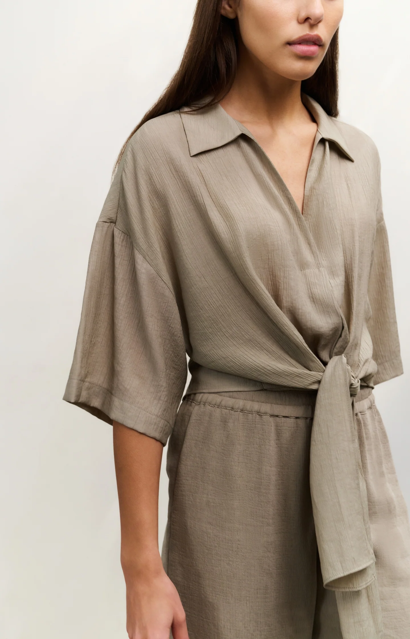 This airy top is made from a flowy fabric with a subtle crinkle texture. It features wide short sleeves, a V-neckline, a loose fit, and a classic collar. The knotted detail at the front adds a casual touch to the relaxed fit. A versatile piece for a stylish, feminine look. The model is 178 cm and wears size 36.