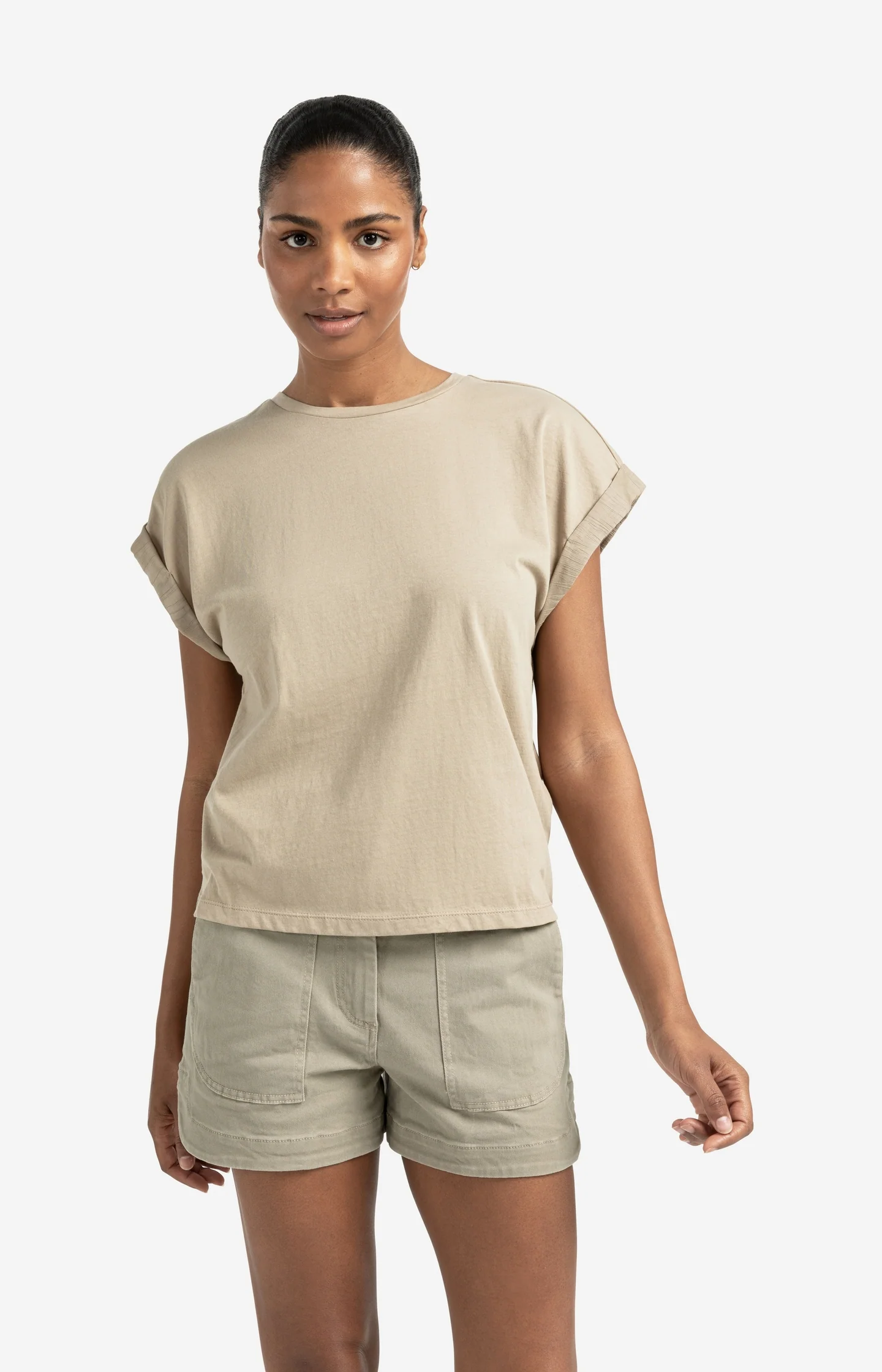 This relaxed top is crafted from soft cotton and features short sleeves with wide woven cuffs. Designed with a round neckline and a regular fit, it offers a timeless look with a refined touch. The subtle sleeve detail adds a modern edge to this everyday essential. The model is 176 cm and wears size S.